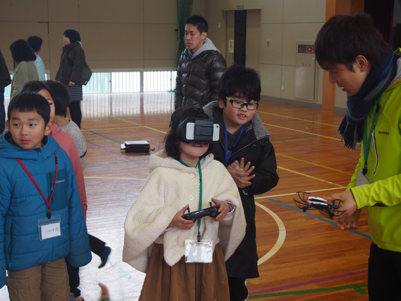 子供達は、3回目になるとドローンを自由に飛ばすことができるようになってきましたので、今回の1部の飛行コースではFPVに挑戦してもらいました。FPVは、「一人称視点」「最前列からの眺め」といった意味で、カメラと映像送信装置をドローンに搭載し、ゴーグル(ヘッドセット)を身に着けた操縦者が、リアルタイムにその映像を見ることができる機能のことを言います。初めて見る映像だった思いますがうまくドローンをコントロールしている姿に教えながらも感心しました。また、参加者と空撮しましたが、その映像に興味深々。子供達だけでなく、保護者からも講師の先生に質問が飛び交っていました。