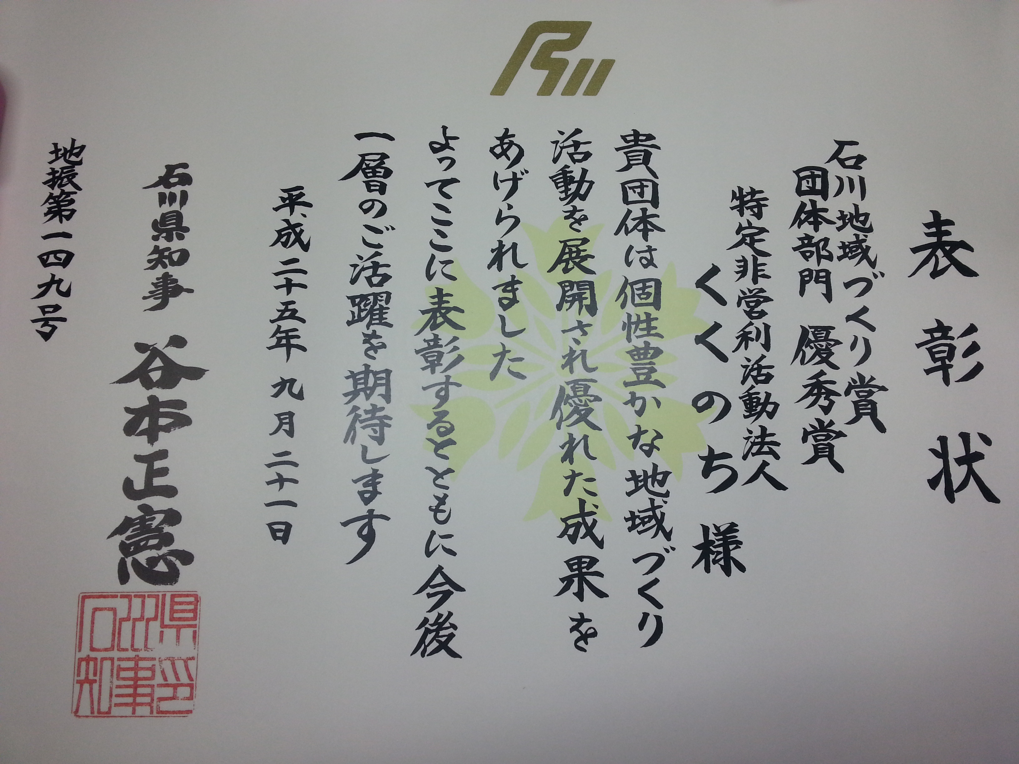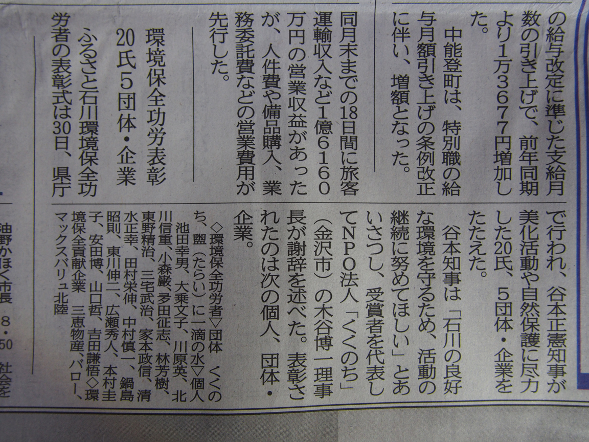 この度「特定非営利活動法人くくのち」は、石川県よりふるさと石川の環境を守り育てる活動に率先して取り組み、その成果が顕著であり、他の模範となる者として、「平成27年度ふるさと石川環境保全功労者知事表彰」を受賞しましたので、お知らせいたします。