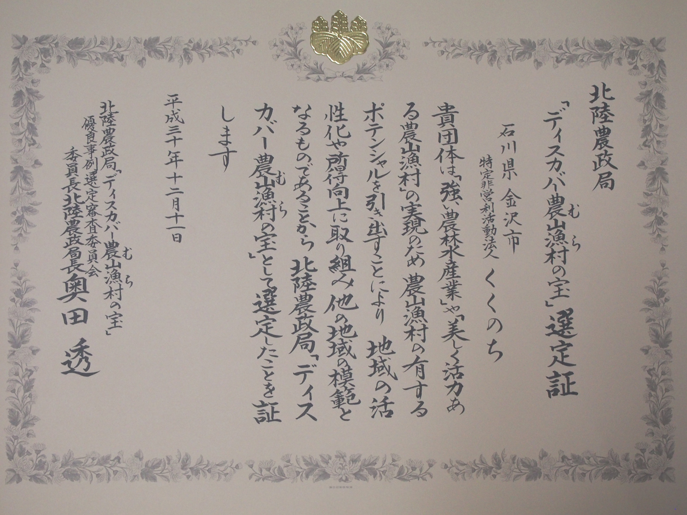 【平成30年度北陸農政局「ディスカバー農山漁村(むら)の宝」選定証授与(平成30年12月11日)】
