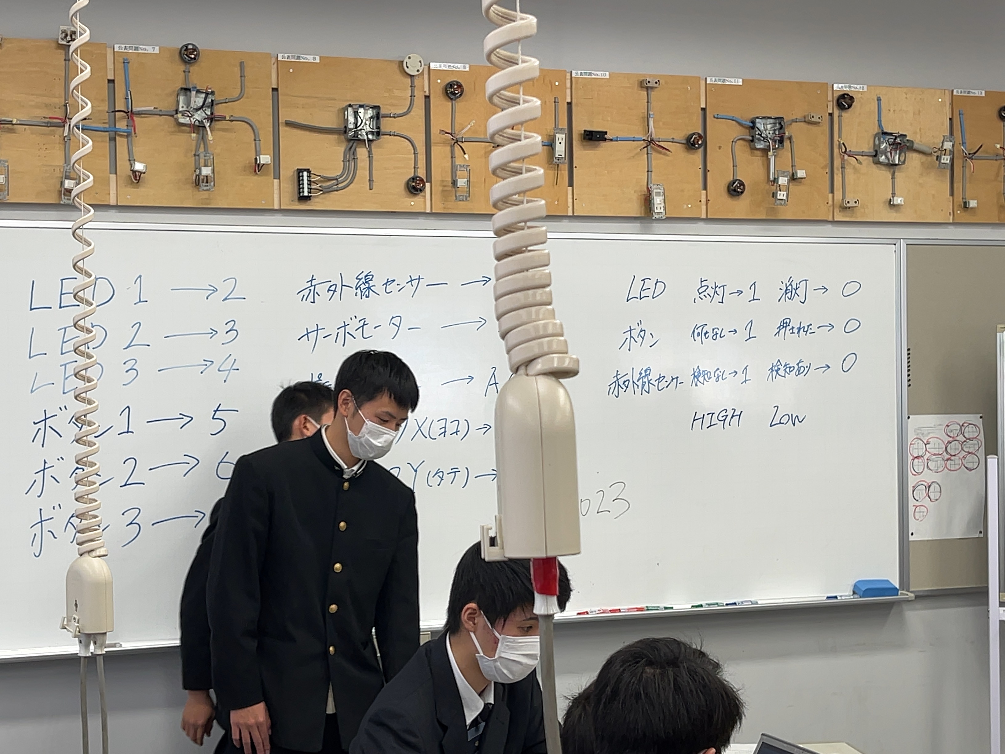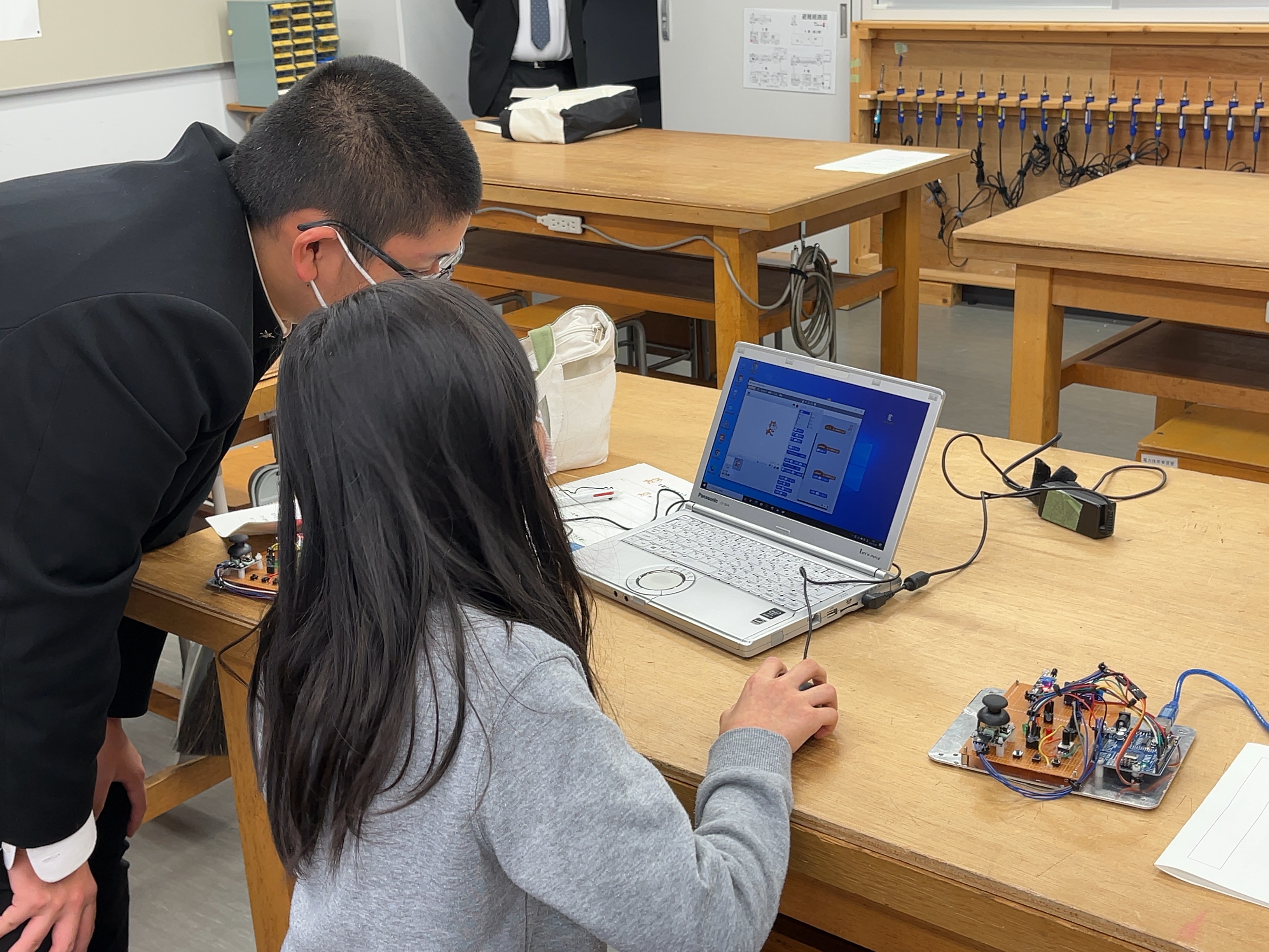 今回は、金沢北陵高等学校、金沢市立工業高等学校の高校生が講師となって、プログラミングでLED、ブザー、モーター、ジョイコン等を制御する基礎を学びました。