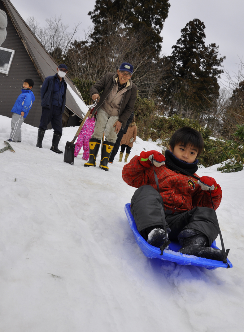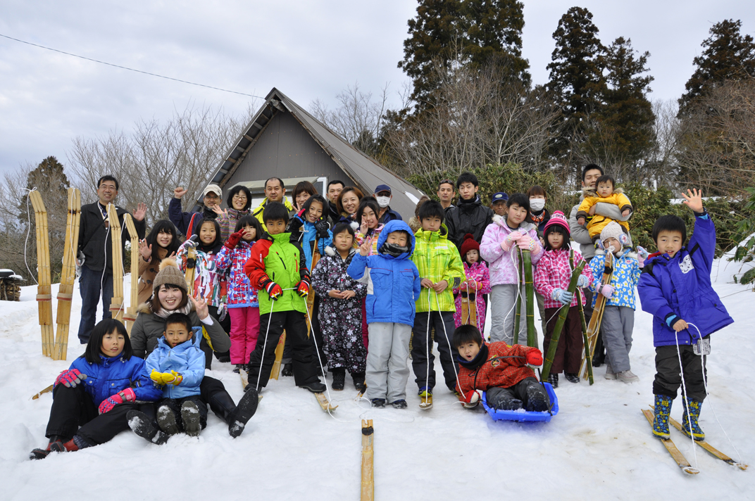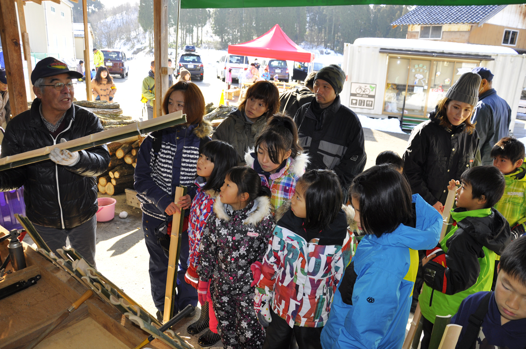 午前は、東原町の諸先輩方から道具の付き方や直伝の竹スキーづくりを教わり、手作りゲレンデで滑走。日ごろ使い慣れない、小刀をはじめ、いろんな道具を使って竹スキーづくりに熱中してました。子供は勿論、大人のほうが雪上ではしゃいでいたような感じです。